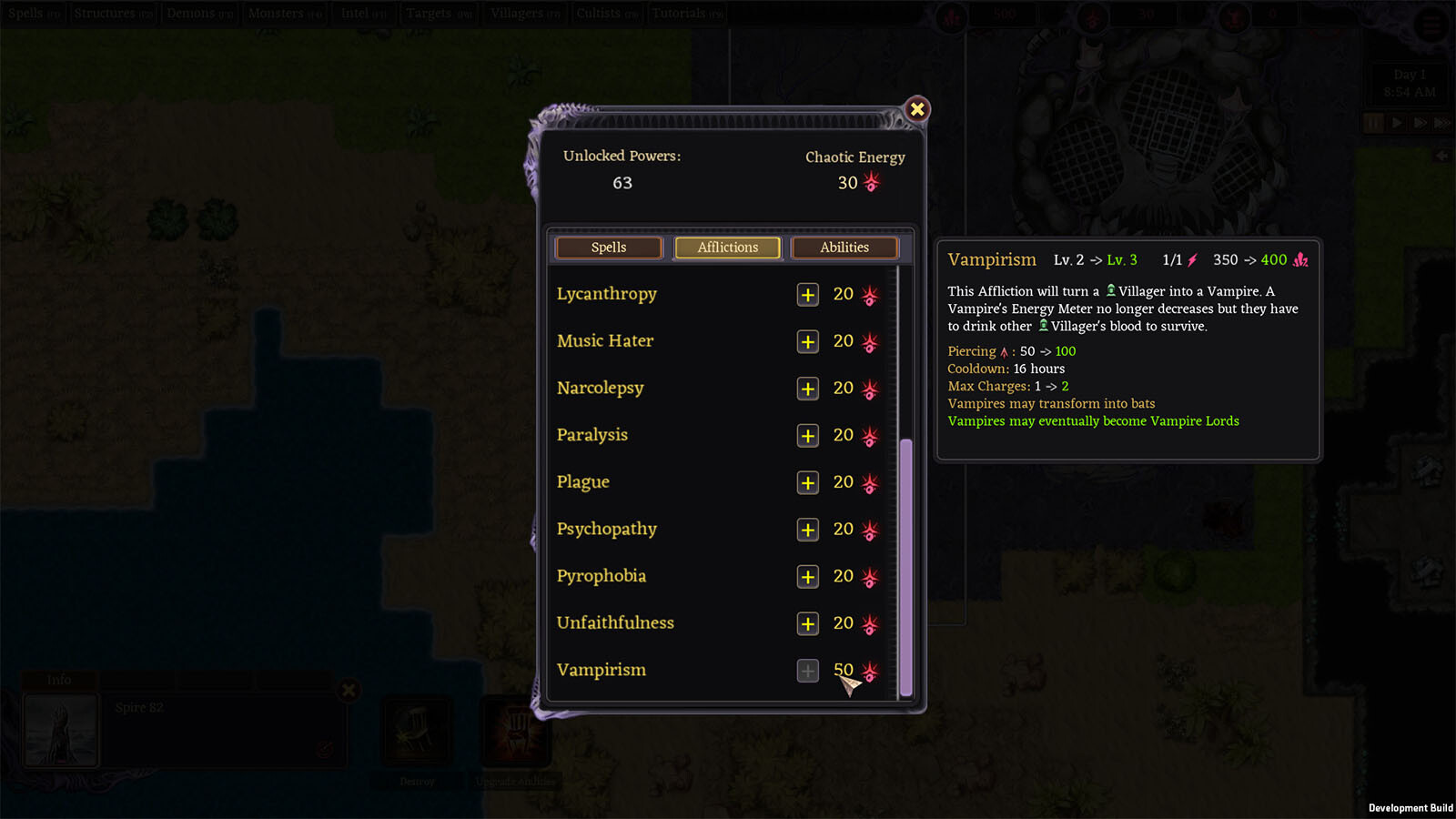 Afflict a Villager with Vampirism or Lycanthropy to turn them into denizens of the night. Watch as they terrorize their neighbors and spread the curse! You may eventually see the Village fight back and start Vampire and Lycan Hunts.