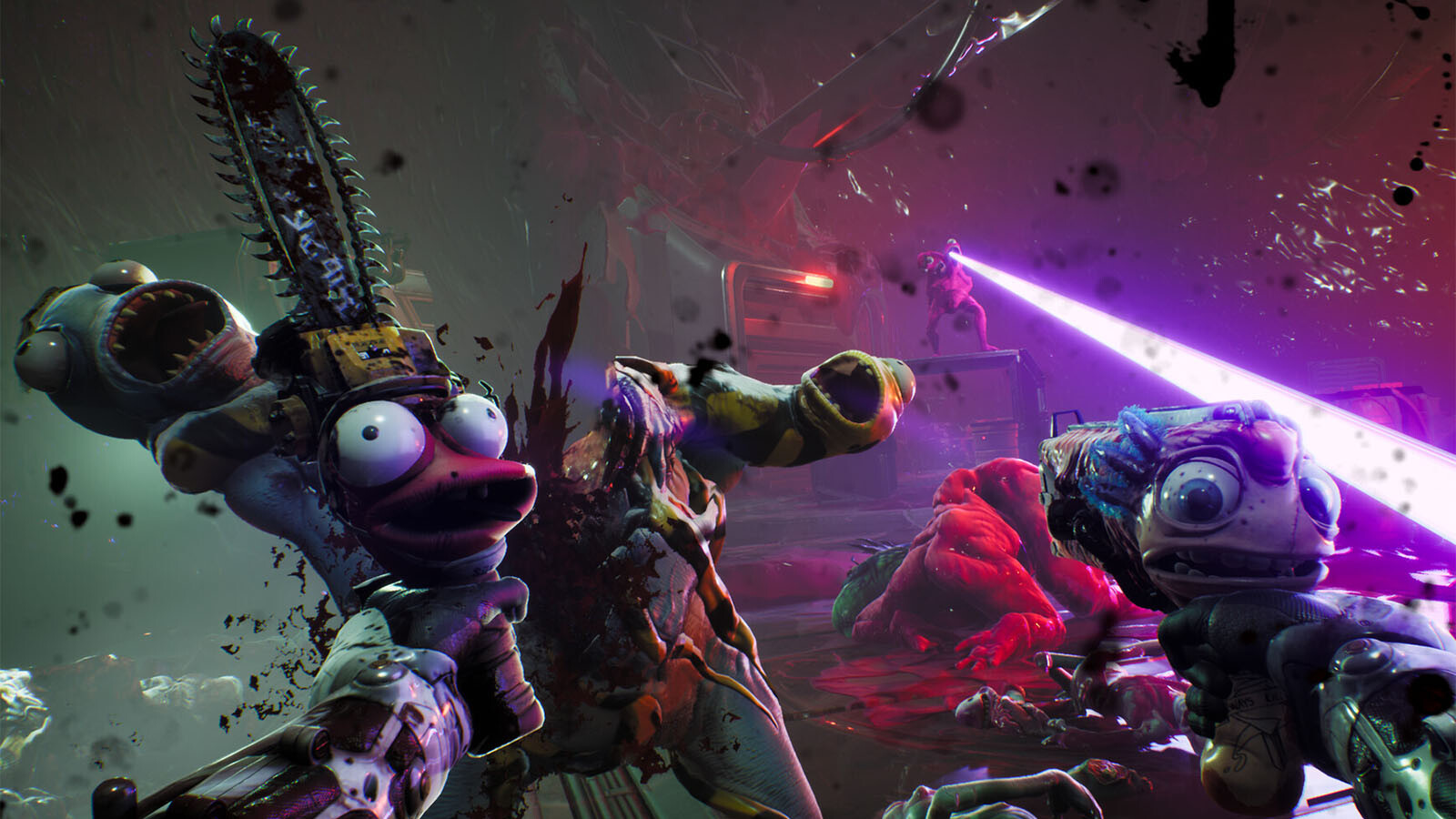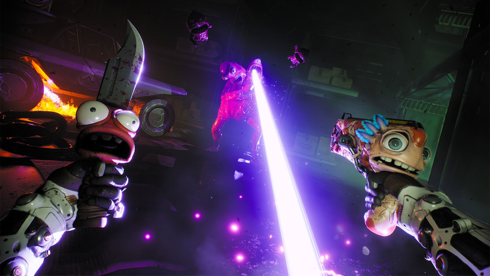 And then there’s High On Knife, the meaty DLC centered around that talking knife I mentioned earlier. Knifey. His name’s Knifey, and this is his big adventure. He’s gonna find out all about the dark(?) mysterious(?) secrets(?) of his past as you take him and Harper, a brand new talking gun, to a salt-planet filled with dying slugs. And then from there maybe you’ll meet a giant guy, race some slow-as-hell slugs, or go for the high score in Peroxosquash with B.A.L.L., another new talking gun. We really packed this DLC full of new stuff, trust me. And we didn’t even get to the spooky parasite-filled shipping warehouse run by a ruthless, monstrous CEO.