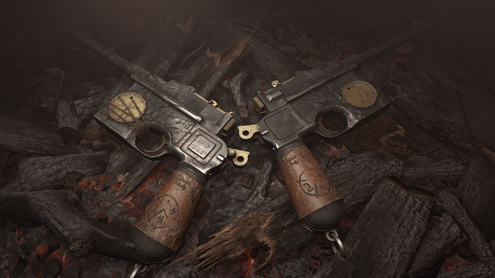 Washed down the gulch in a bracken flash flood, the only weapons The Turncoat could find were a pair of Dolch 96s. Naming them Crossfire and Ambush, they accompanied him ever since, adorned with mementos of his fallen friends.