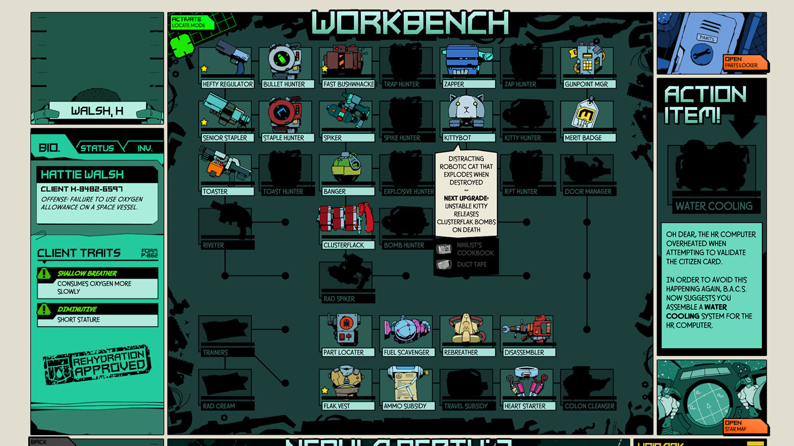 Use your hard won supplies to improvise tools and weapons, from the distracting robo-kitty to the horribly unstable clusterflak.